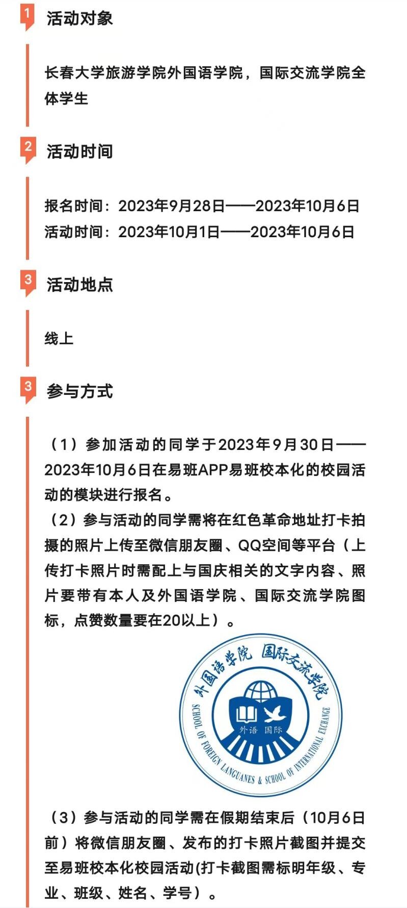 为深入开展学习贯彻习近平新时代中国特色社会主义思想主题教育,激发和培养大学生的爱国精神,传承中国优良传统,振奋民族精神,传递爱国主义情怀,10月1日-6日,外国语学院(国际交流学院)学生党支部举办“行走在祖国的大地上”红色革命地标打卡活动,号召学生利用国庆假期前往各大红色地标进行学习打卡,用实际行动抒发爱党爱国情怀,用饱满热情庆祝祖国74周年华诞。