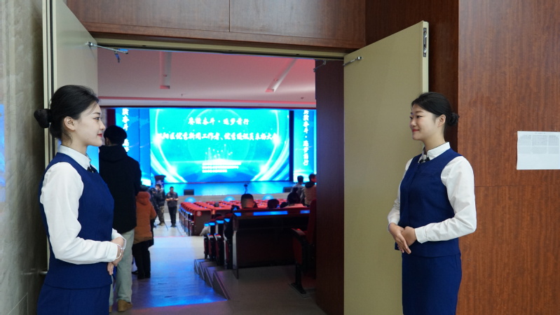 16名志愿者学生们怀揣着谦虚的学习心态和饱满的精神状态学习每一个服务细节,在活动前期,累计进行了为期2天历时20余小时的现场彩排及演练。11月14日,在学院团委书记张锦华、党总支组织员英冀、团委学生副书记田茂欣、新媒体运营中心副主任张姿涵的带领下,从学校出发赶往双阳区委党校,活动中同学们按照大会流程和所学服务技能有条不紊的进行会场的引领、颁奖环节、礼仪服务等志愿服务工作,同学们以追求卓越、严谨负责的服务态度赢得双阳区领导及参会人员的一致认可。