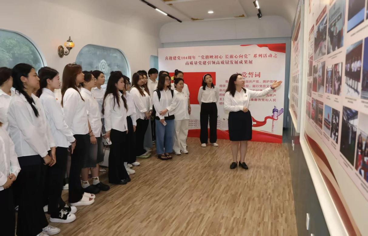 为庆祝中国共产党成立104周年,深入学习贯彻党的二十大精神,进一步增强党组织的凝聚力和战斗力,激发党员的责任感和使命感,6月30日,艺术学院党总支组织全体师生党员赴“东北亚长旅号”旅游观光班列复刻车厢,开展了一场别开生面的“党旗映初心 长旅心向党”主题党日活动。此次活动也是学校喜迎建党104周年系列活动之高质量党建引领高质量发展成果展的重要组成部分,艺术学院全体师生党员参加此次活动,活动由党总支组织员王雪讲解。