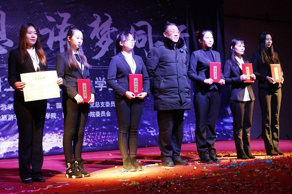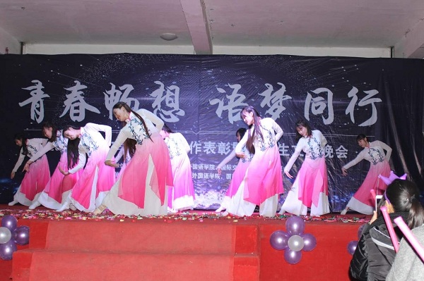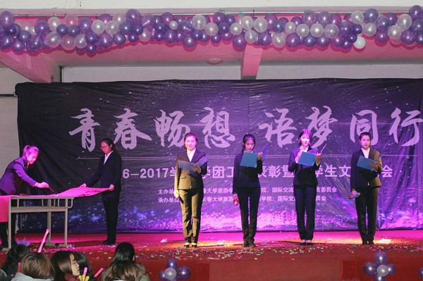 2017年12月14日晚,中共金沙js9线路中心外国语学院、国际交流学院党总支委员会主办,共青团金沙js9线路中心外国语学院、国际交流学院委员会承办的“青春畅想 语梦同行”2016-2017学年学团工作表彰暨大学生文艺晚会在大学生活动中心顺利举行,学校党委副书记、副校长马维东,校长助理、学生工作处(部)处长高阳,校团委书记贾烊,外国语学院、国际交流学院院长黄江教授,各学院党总支书记、团委书记,我院副院长王丹、办公室、教研室和全体辅导员老师出席了晚会。