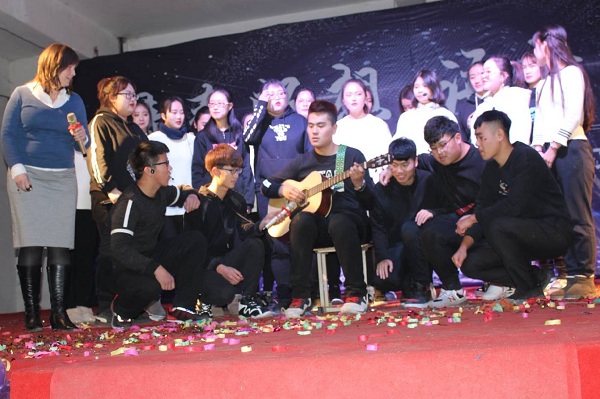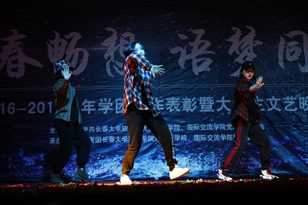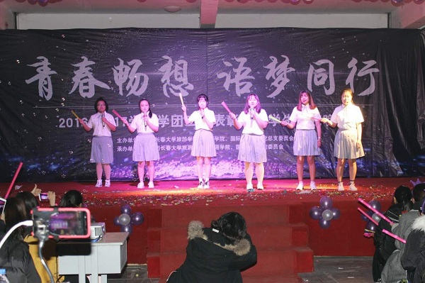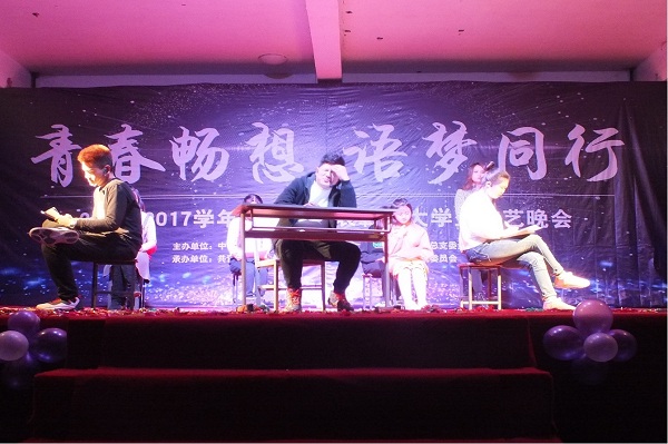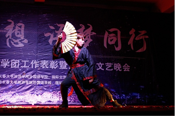 日籍教师藤原务与17级日语班的歌曲《老男孩》、俄籍教师雅娜与17级俄语班的情景剧《青葱岁月》掀起了晚会的小高潮。