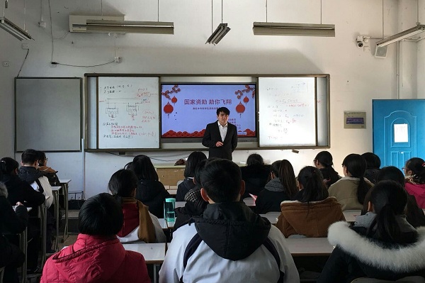 外国语学院1620103班学生周洵于2018年1月12日回到平湖市当湖高级中学为全体高三家庭贫困学生宣传讲解国家资助政策并发放全国学生资助管理中心印发的“国家资助 助你飞翔”高校本专科学生资助政策简介,让广大学生更全面、更准确的了解国家资助政策。