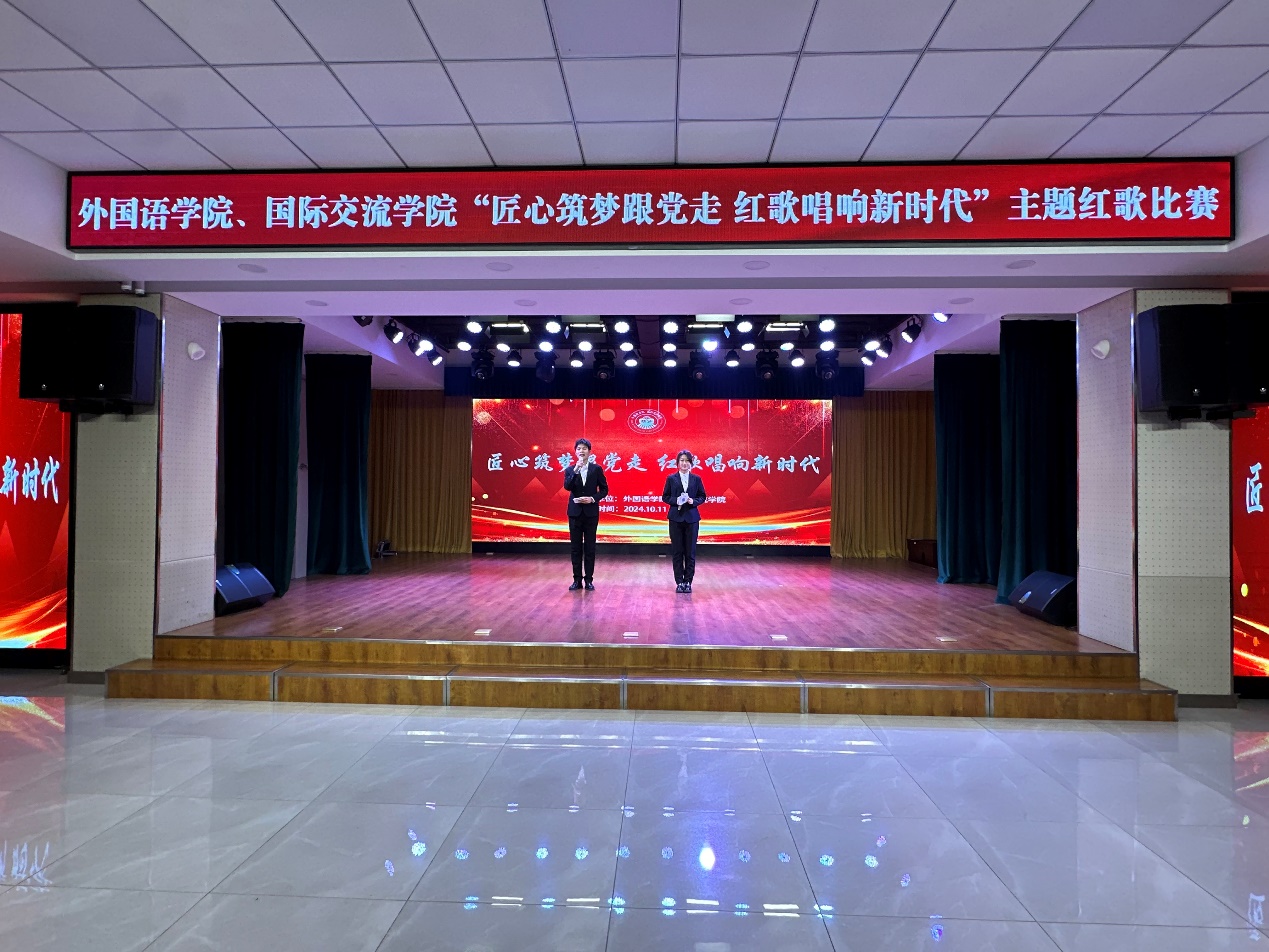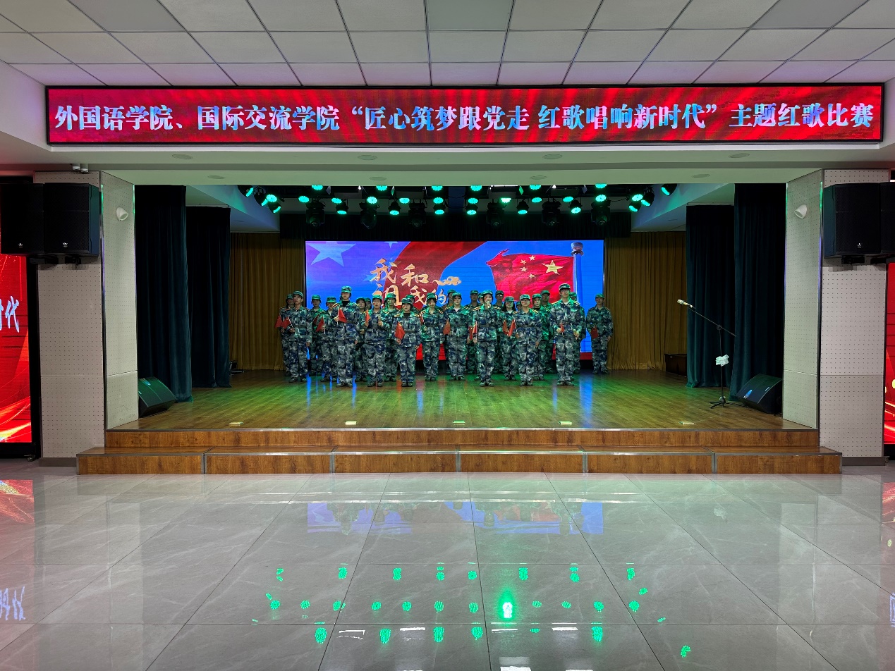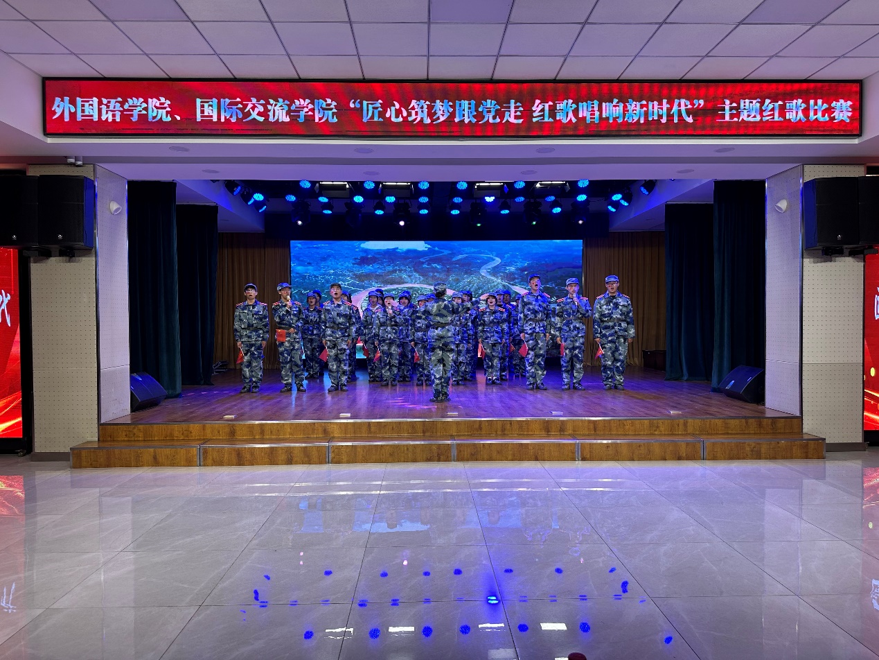 金秋送爽,万里山河披锦绣,大美长旅,高歌欢唱寄深情。为弘扬爱国主义精神,用红色文化启智铸魂,丰富军训文化活动,10月11日,外国语学院、国际交流学院在大学生活动中心举办“匠心筑梦跟党走 红歌唱响新时代”主题红歌比赛。本次比赛由学院党总支书记孙野、辅导员沈鹏飞、刘凯、王瑀晰、徐嘉桧担任评委。