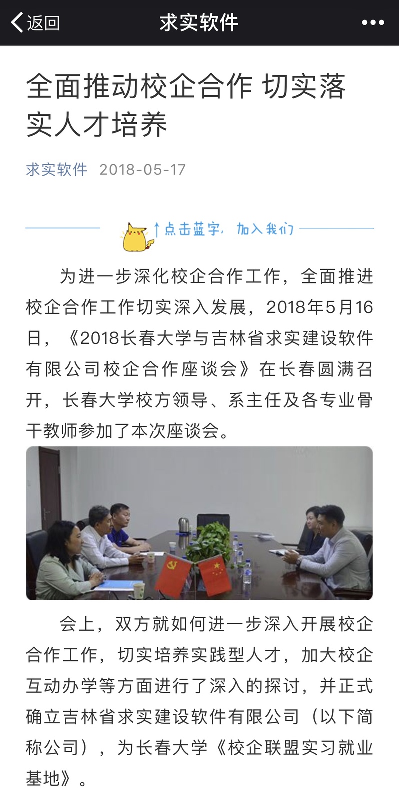 2018年5月16日,工学院院长李晓东教授,工程造价专业学科带头人高峰教授,工程造价教研室杨晓辉老师与吉林省求实建设软件有限公司校企合作事业部金龙经理等人就深入校企合作举行了座谈会。
