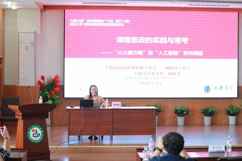 上海高校思想政治理论课名师工作室——“顾晓英工作室”主持人、上海大学教务处副处长顾晓英教授作了题为“课程思政的实践与思考”和“课程思政金课建设的教务管理”的培训报告。她介绍了上海大学用“项链模式”教学法精心打造“大国方略”系列课程和“人工智能”系列通识课的全过程,分享了上海大学课程思政建设工作的创意策划、课程目标、教学方法、主要成果和已有经验。她指出,高校教师要提高站位,积极对接国家战略,准确把握课程特点,挖掘、发挥课程自身所蕴含的思想政治教育元素,实现知识传授与价值引领同频共振,协同育人。