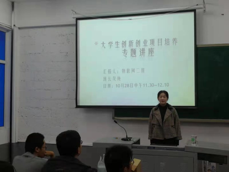 张老师的报告结束后,18级物联网2班班长吴庚基于18学生已经有申报并完成“大创”论文的基础给19级新生介绍了大学生创新创业项目开展情况,吴庚同学传授给19级新生一些写作经验,从论文格式开始,说到命题,说到论文结构及内容,以自己发表的论文为例,给新生带来了全新的体验。
