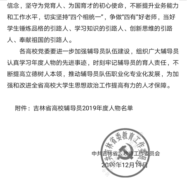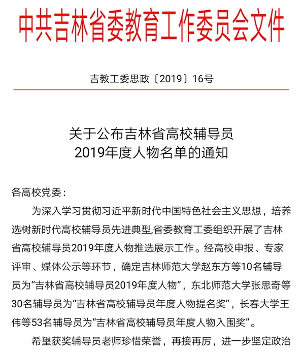 近日,吉林省高校辅导员2019年度人物评选结果揭晓,我院团委书记、学生工作办公室主任、辅导员王磊入选吉林省高校辅导员2019年度人物提名名单,系金沙官网首次获得此奖项。