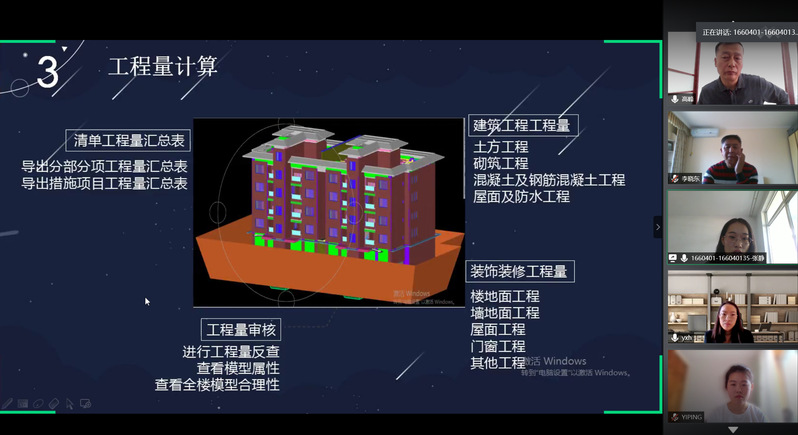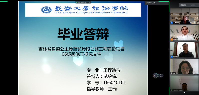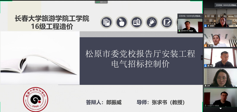工程造价教研室高度重视毕业论文(设计)答辩工作,成立由学院副院长高峰教授担任组长,杨晓辉工程师、王瑞工程师担任组员,宫越工程师为记录员的答辩小组。答辩小组在5月末即启动答辩工作,包括前期筹备、软件测试、答辩次序安排、答辩预演、紧急预案等诸多工作,以确保毕业答辩能够按期保质顺利完成。答辩当天,早晨八点准时启动答辩工作,下午四点半完成毕业班38名同学的业论文(设计)答辩工作,工学院院长李晓东教授、教务处副处长满歆琦全程线上观摩指导。