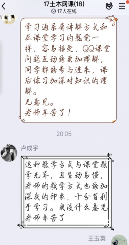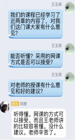 从初次使用网络授课的又慌又累,到现在带给我的那份惊喜,这种授课方式打破了教师一讲到底的传统教学模式,给予了学生更多自主学习的时间和空间。精心设计的每一部分的思考题、习题、讨论内容,增加了在课堂时间里与学生的互动,这使得遥远的距离瞬间变成心灵相通。课后收到的学生课堂笔记、标注的疑问、所做习题的解答,让我对他们课程的学习情况有了及时的了解。虽然网上教学使得教师的工作量大大增加,但身为教师,不就是传到授业解惑吗?可以自豪的说我们经得起这样的挑战!