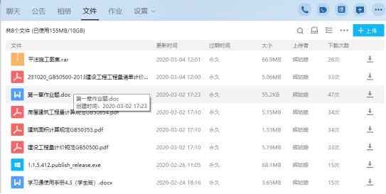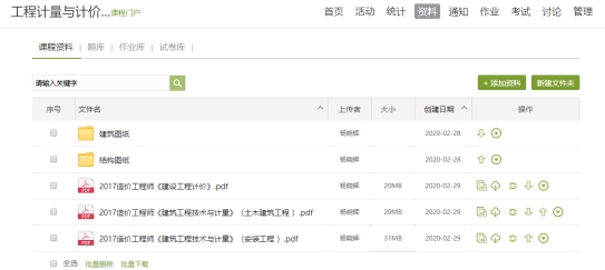 确定了授课模式后,我便立即按照课程名称建立了QQ群,一是方便各位同学实时接收信息,信息不容易被删除;二是能够上传课程资料,而且能够永久保存。在QQ群文件里,我上传了腾讯会议的安装包文件,通知全体学生在电脑和手机上都安装腾讯会议软件,在开课前一周进行集体试课。由于我的课程涉及众多规范和图集等参考书籍,如果在学校,我会要求学生去图书馆借阅,为方便授课,在开课前,我将可能用到的诸多参考书电子版均上传至QQ群,以备讲课时查阅。此外,在学习通上,我建立了丰富的线上课资源,包括上传PPT、建立与本课程有关的资源库、作业库、与中国大学MOOC链接、设置讨论等,以便拓展及巩固所学内容。