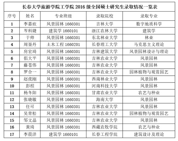 栀子花开季,金榜题名时。随着全国硕士研究生考试录取工作的完成,我院考研喜报频传。在全体师生的共同努力下,我院2020届本科100名毕业生中共有17名同学分别被吉林大学、东北林业大学、西南林业大学等院校录取, 学院2020年度考研录取率为17%。