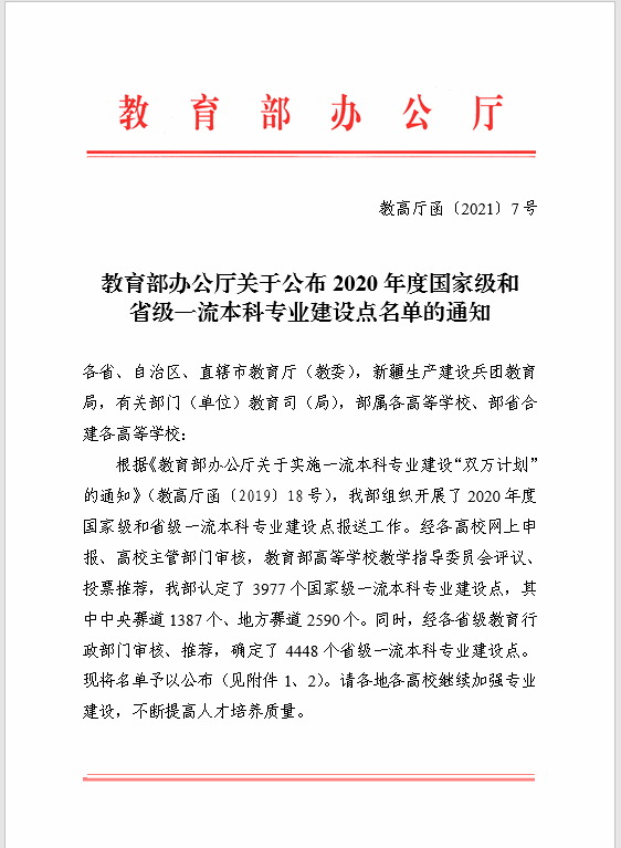 近日,教育部发布《教育部办公厅关于公布2020年度国家级和省级一流本科专业建设点名单的通知》(教高厅函〔2021〕7号),我院风景园林专业获评省级一流本科专业建设点。