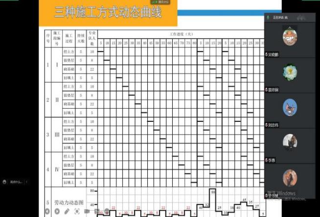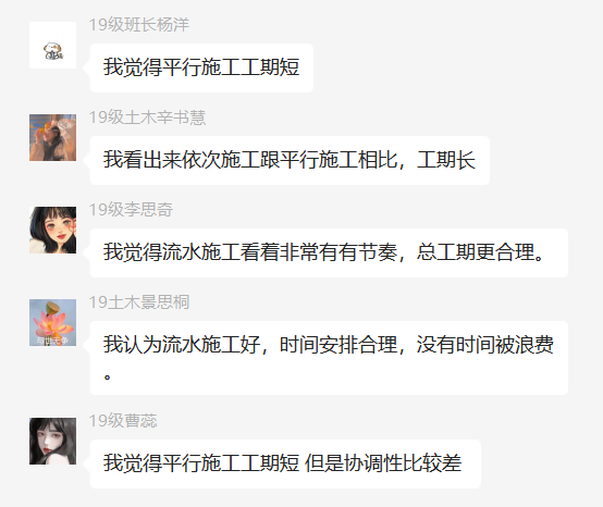 首先进行上次课后作业总结,分析学生作业中存在的问题,激励学生按时、高效完成任务。课中通过针对重点难点内容结合PPT及视频等资源进行讲解,注重课件设计及思维导图总结,加深学生的理解。例如教师通过实例比较依次施工、平行施工和流水施工的施工效果,首先结合火神山、雷神山的施工流程介绍三种不同施工方式;其次引导学生归纳总结出不同施工方式的优缺点,通过对三种不同施工方式的动态曲线对比,让学生对流水施工的概念有了更加直观的认识;最后分别让学生例举工程中不同施工方式的应用。通过教学活动的演练,学生们对流水施工的概念及重难点有了更深刻的理解。