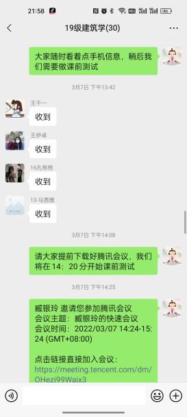 臧银玲老师保证每堂课开课前,至少提前三十分钟检查网络是否有异常,无则正常授课;如有问题立刻启动备用授课方案;然后通过微信发布学习通打卡通知,开启签到(30分钟有效)。上课前10分钟,进入腾讯会议直播平台,进行课前测试。并且,臧老师严格按课表时间准时上课。她利用腾讯会议,进行本门课程的直播讲解,课中积极和学生互动,充分调动学生的积极性。