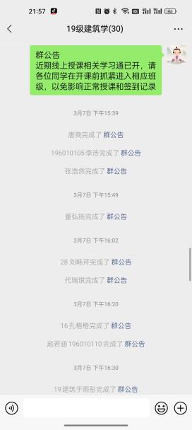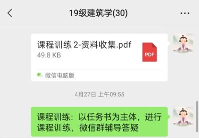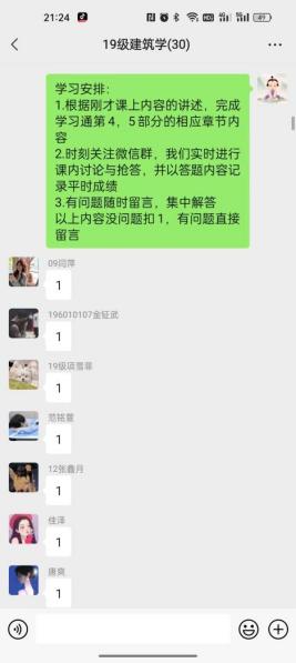 直播教学结束后,臧老师安排学生打开学习通客户端,进行拓展学习,加强巩固。学生在学习通自学期间,臧老师会通过微信群实时添加“抢答”等教学活动,以达到串联课堂,丰富内容的目的。臧老师也会充分利用学习通、微信群等文字交流区,实时掌握学生自学进度与状态和课后作业完成情况,做到与学生同步;直至课程结束,臧老师认真进行下课签到活动,同时积极解答学生课后反馈,并通过微信联络群发放课后作业并实时跟踪进度情况,避免教师和学生的互动的时效性受时间、空间因素的制约。