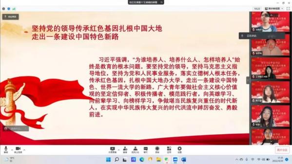 活动期间,我院同学积极参与其中,踊跃发言,灵活运用线上平台,通过展示PPT、讨论交流等方式开展主题活动,从中了解到习近平总书记希望全国广大青年牢记党的教诲,立志民族复兴,不负韶华,不负时代,不负人民,在青春的赛道上奋力奔跑,争取跑出当代青年的最好成绩!