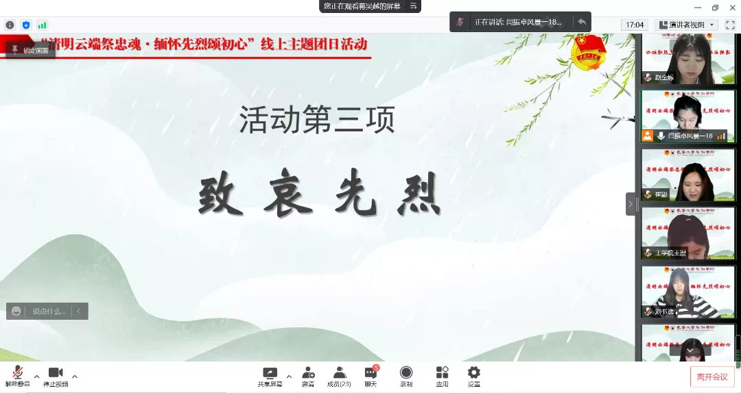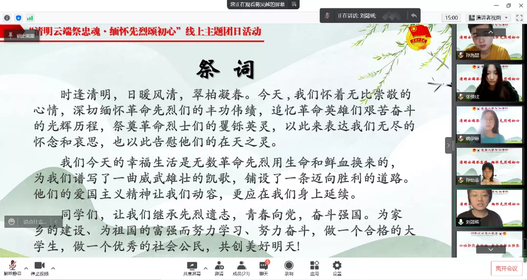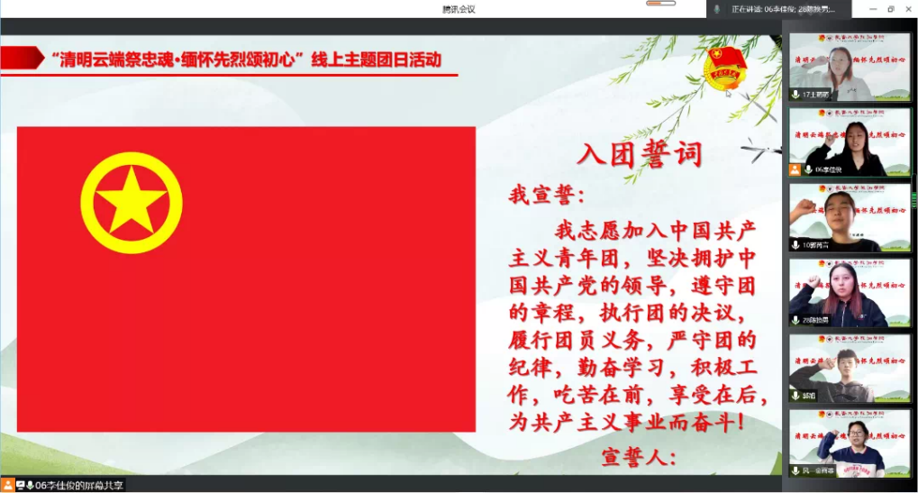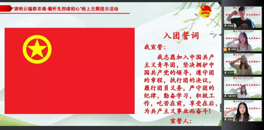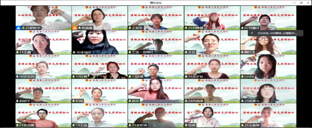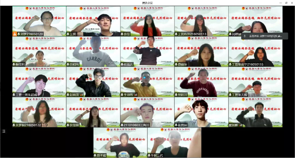 “清明雨洗烈士墓,挥笔祭出英雄魂。”为响应校团委号召,表达对先烈的真挚缅怀,引导广大学生培养正确的价值观和历史观,激励青年学生为自己的信念努力奋斗。4月5日,我院开展“清明云端祭忠魂,缅怀先烈颂初心”线上主题团日活动。