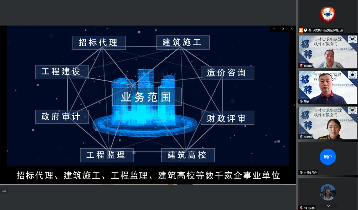 最后,高峰对本次线上招聘会的宣讲再次表示感谢,吉林省求实建设软件有限公司作为校企合作优质企业,从LOFT学社成立及活动举办、每一届“求实杯”建筑CAD大赛举办、实习就业等多方面给予支持,今后校企双方将多元化深化合作,互相支持、双向介入、优势互补、资源互用,共同培养社会与市场需要的人才。