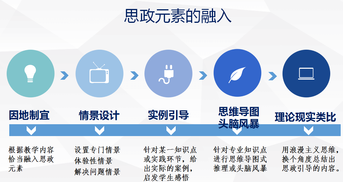 思政元素的融入方法有很多,经过大家探讨,主要总结包括因地制宜、情景设计、实例引导、思维导图头脑风暴、理论现实类别等方法,可根据课程特点和内容选用适当的融入方法。