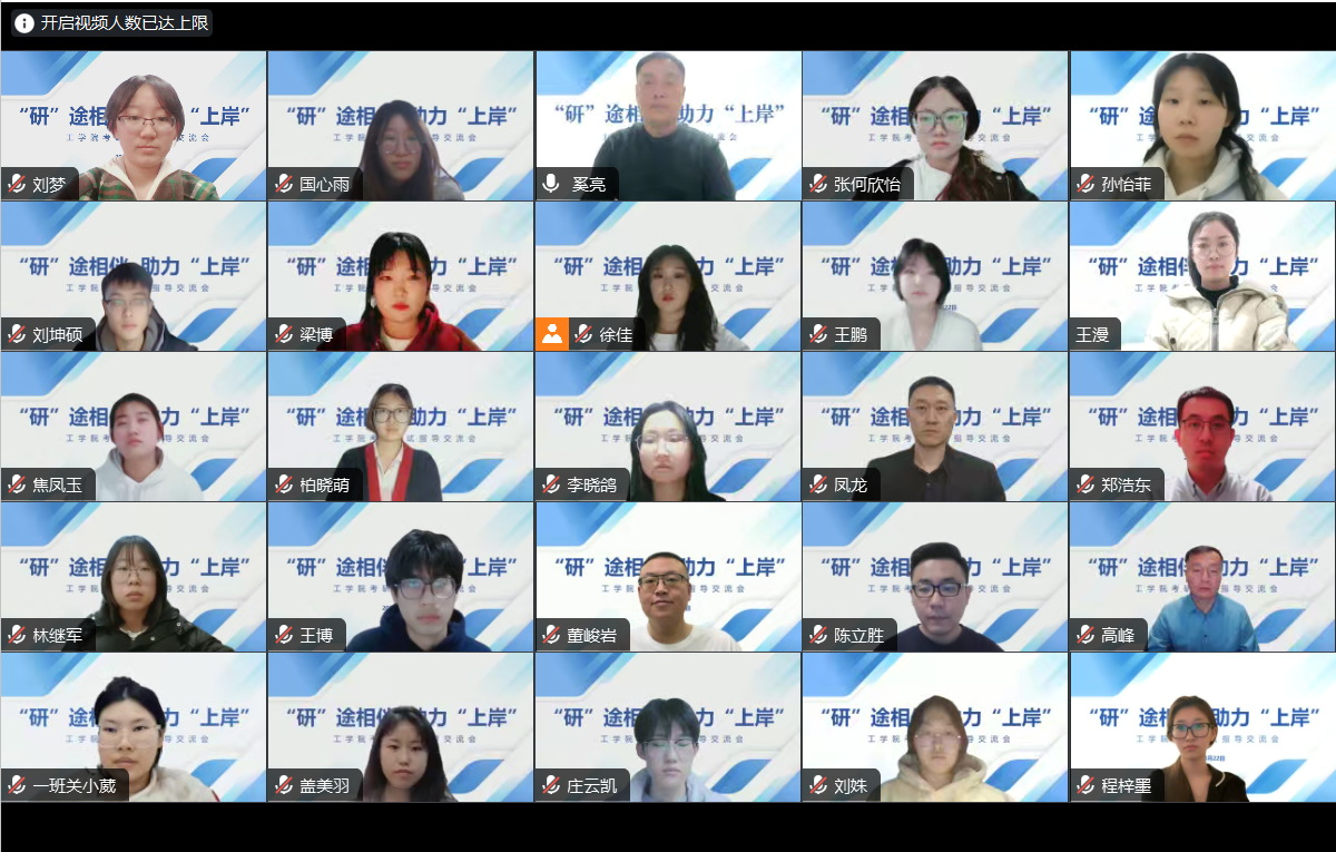 为做好2024届毕业生考研复试指导工作,精准把握复试需求,增强复试信心,帮助学生提高考研上岸率,近日,工学院举办“研”途相伴,助力“上岸”考研复试指导交流会。会议采取线上形式召开,工学院院长高峰、党总支书记凤龙、副院长董峻岩、建筑学专业教师陈立胜、风景园林专业教师郑浩东、毕业班辅导员奚亮、成功考入东北大学研究生的2022届毕业生任书池同学以及进入考研复试的22名学生参加会议。