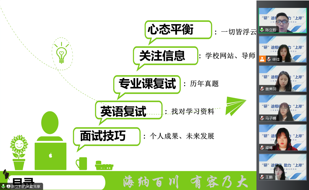 陈立胜围绕复试流程、面试技巧、专业素养等方面进行深入剖析,从专业的角度为同学们提供了针对性的指导;郑浩东分析了调剂的过程及注意事项,对复试调剂中常见问题提出了解决方法和建议;奚亮以应试心理为切入点,引导同学们调整自身心态,积极搜集相关资料,从容应对面试。