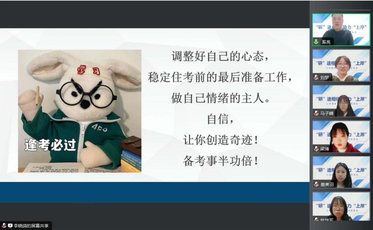 高峰勉励同学们要充满信心,做好充分准备,同时注意政策变化,把握时机,以积极的态度准备复试和调剂相关事宜,祝愿大家一切顺利,一战成硕。