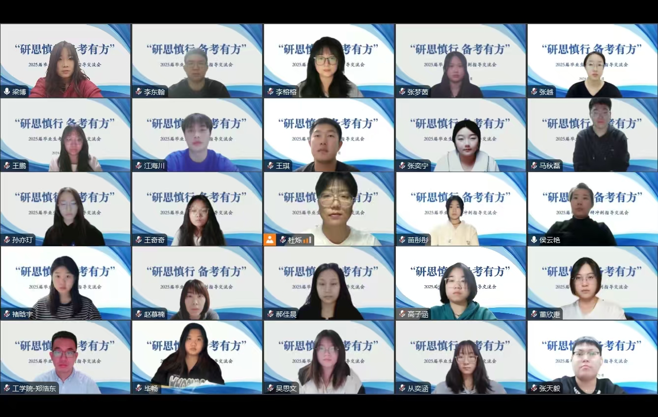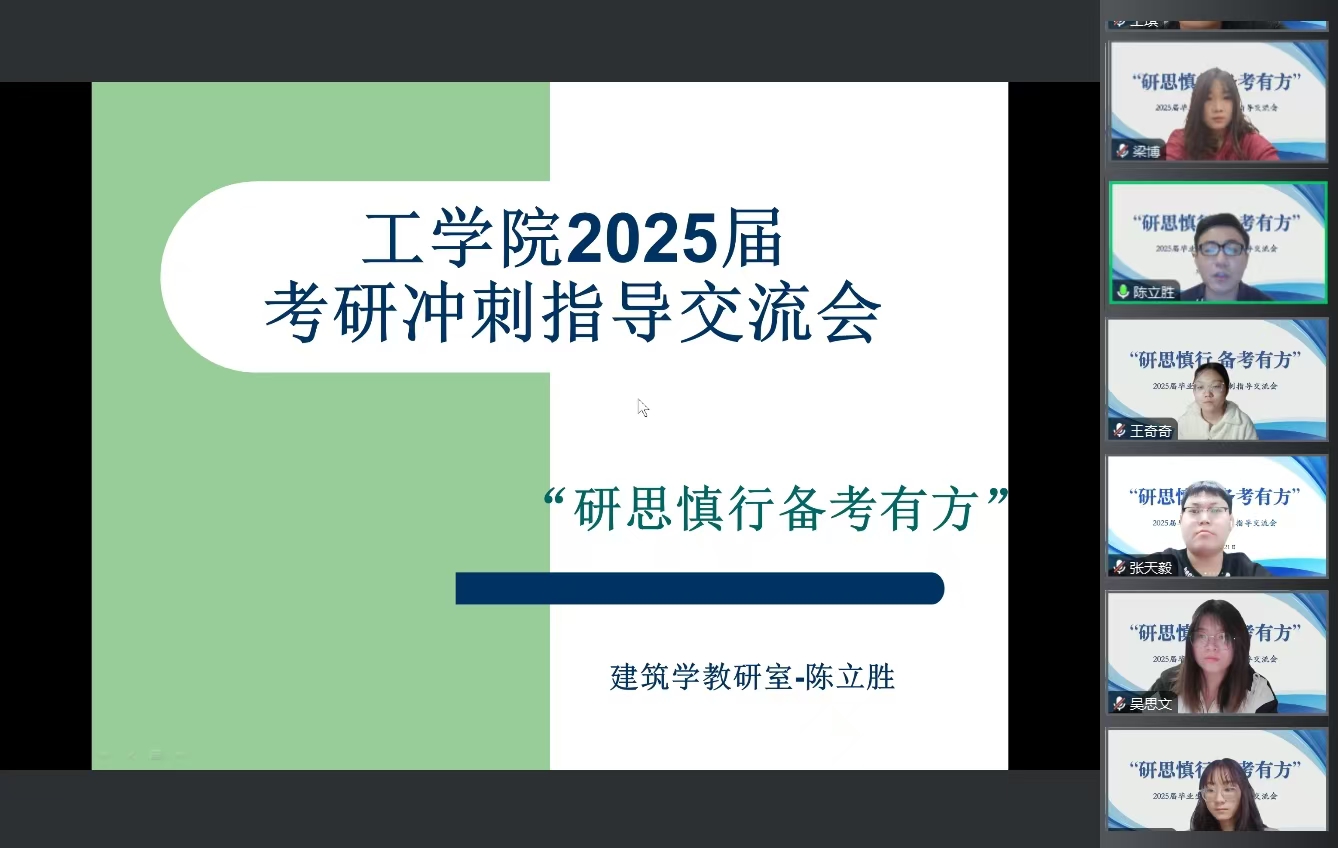 正值考研冲刺之际,为进一步增强学生考研信心、缓解心理压力,全面提高复习质量,11月21日,工学院通过腾讯会议召开“研思慎行,备考有方”考研冲刺指导交流会。会议邀请2020级校友延边大学风景园林硕士研究生秦沐芯、南京林业大学硕士研究生黄谦庭、沈阳农业大学硕士研究生王漫作考研冲刺指导。工学院院长高峰、党总支书记仇岩、各相关专业教师、辅导员及考研学生参加会议。会议由仇岩主持。
