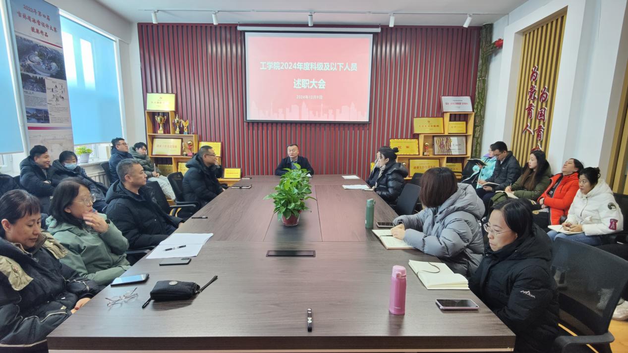 为总结与回顾2024年度的工作,规划和展望学院未来发展,促进学院各部门之间的交流与合作,12月9日下午,工学院在党建活动室召开2024年度科级及以下教职工述职大会。院长高峰,党总支书记仇岩,副院长董峻岩,各专业带头人、教研室主任及学院全体教职工参加会议。会议由高峰主持。