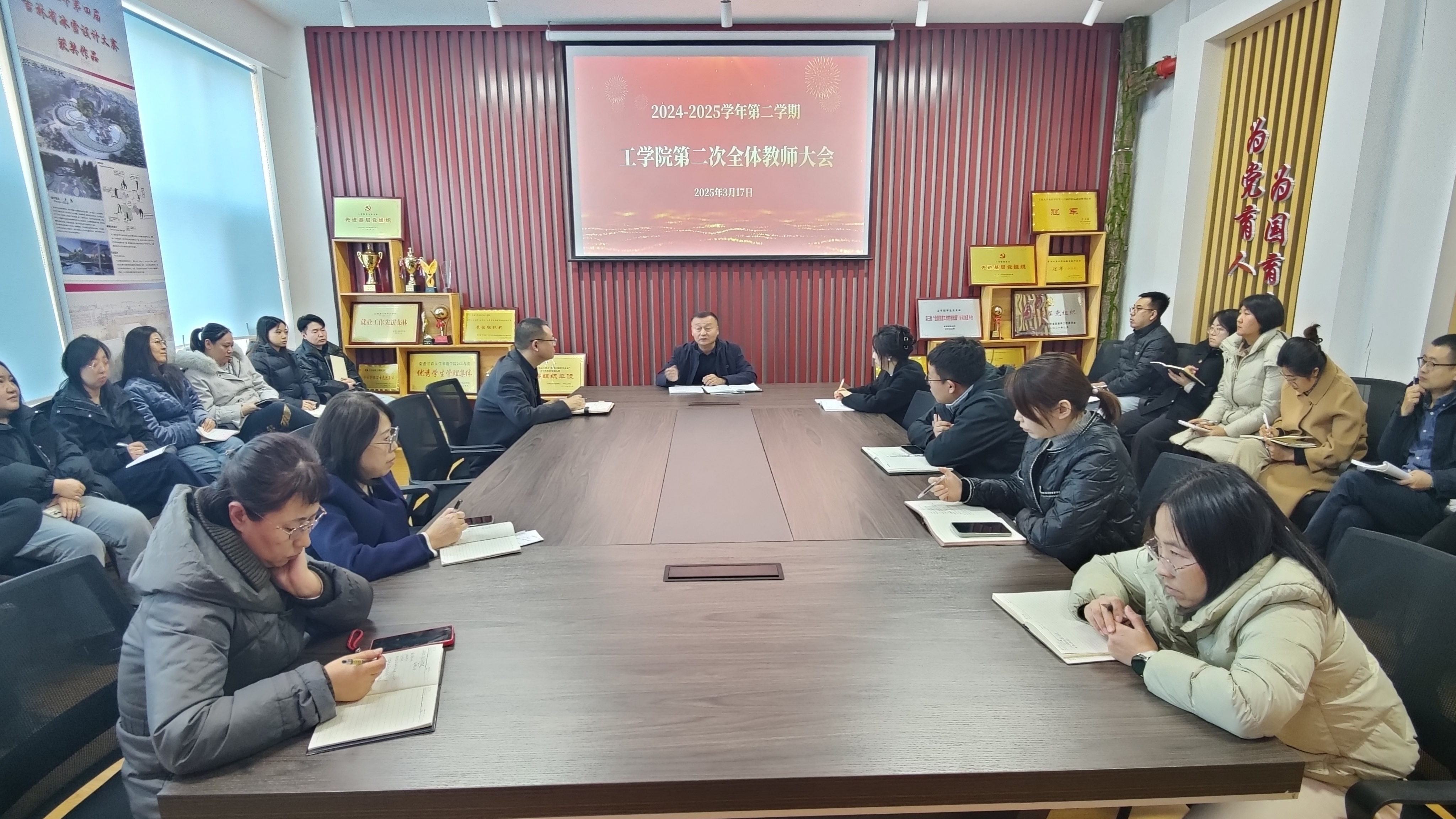 3月17日,工学院召开第二次全体教职工大会,院长高峰、党总支书记仇岩、副院长董峻岩及全体教职工参会。会议围绕“学院品牌建设、科研攻坚突破、专业集群发展、管理增效提质”四大核心任务展开系统部署,为2025年学院高质量发展擘画实施路径。