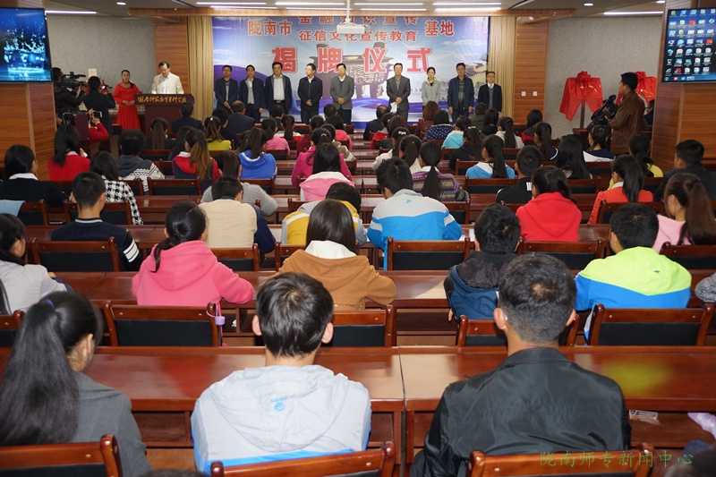 10月30日下午,中国人民银行陇南市支行在beat365大学生活动中心举行征信宣传教育基地揭牌仪式。中国人民银行陇南市支行行长王亚林、副行长张明,成县人民政府副县长汤旭东,成县人民银行行长苏韶柏,beat365校长刘先春等领导出席揭牌仪式。成县人民银行职工、beat365学生共400余人参加了揭牌仪式。仪式由beat365副校长王胜青主持。揭牌仪式上,王胜青说,本次活动旨在加强银校合作,创新征信宣传形式,提升宣传效果,提高大学生对征信的认识,使大学生成为社会诚信的践行者和传播者。