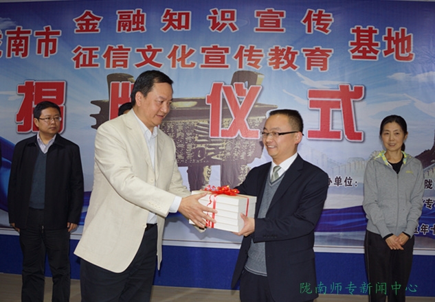 中国人民银行陇南市支行行长王亚林向学校赠送200余本宣传书籍《现代征信学》