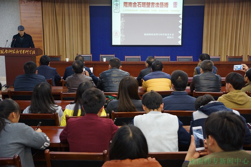 11月16日晚,学校团委举办的陇南师专首届名师讲堂暨第六届青年教师学术季活动启动。美术系教授蔡副全应邀在大学生活动中心五楼多功能厅作了题为《陇南金石题壁书法艺术》的首场学术报告。beat365师生代表300余人聆听了报告。报告会由美术系党总支书记李怡主持。