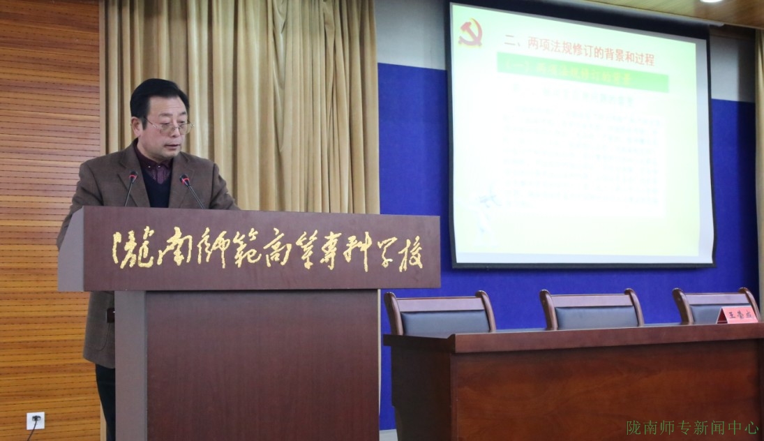 会上,王莹成围绕《准则》、《条例》修订和颁布的重大意义;修订的背景和过程;修订的基本原则;《准则》、《条例》的特点、作用和主要内容以及学习贯彻等五个方面作了宣讲报告。他对《准则》进行逐条解释,对《条例》有关条目进行了重点解读,采用新旧法规对照对比等方式,结合反面典型案例,答疑解惑。他要求,全体党员特别是党员领导干部要以《准则》诫心,以《条例》限行,在制度的“笼子”里阳光践行党员宗旨,引领良好的校风和社风,争做一名合格党员。他的讲解让大家更加直观深刻地认识到,《准则》要求哪些“在先”、哪些“在后”;《条例》约束哪些“可为”、哪些“不可为”,使与会人员受到了一次深刻的党风廉政和严格的政治纪律、组织纪律、廉洁纪律、群众纪律、工作纪律、生活纪律教育。
