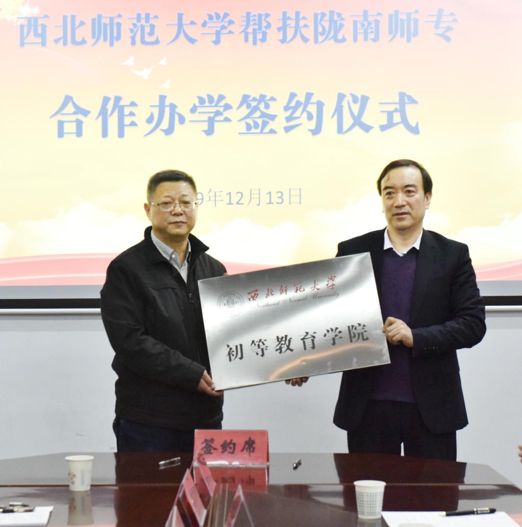 田澍还就如何推进两校务实合作,提出了三点希望:一是高度重视,高标准定位学院发展。要秉承先进办学理念,高标准定位,敢于担当,勇于创新,努力把学院建设成为教育教学、研究教育创新的实验高地,形成标志性办学成果。二是创新模式,高质量推进人才培养。两校相关学院和职能部门要科学制定专业建设规划和人才培养方案,创新培养模式,完善教学组织机构,选派优秀教师和干部严格按照培养标准完成教育教学工作和学生管理工作,确保教育教学质量,推动学生高质量就业。三是相互学习,高水平拓宽合作领域。要做好教师发展规划,对聘用教师进行有计划的培训和研修,通过攻读硕士、博士学位,共同组建科研团队等方式,加强协作,不断提升教师的能力与水平。同时两校要相互学习,不断拓宽合作领域,助力国家“一带一路”倡议实施举措的实践与研究;深化在甘肃华夏文明的传承、地方文化研究等方面的合作与交流,提高基础研究和应用研究水平。