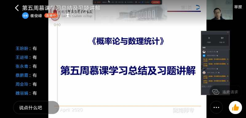 全校学生人数8669名,SPOC必修应选课人数7769名,在线认证学习人数7704名,占比99.16%。截止4月3日,累计登录学习140783人次,日均学习3519人次,视频与文档累计学习37966人次,随堂讨论累计参与24779人次,单元测验与作业累计提交22842人次;直播教学累计应选课61064人次,实际参与直播教学53716人次,到课率87.9%。