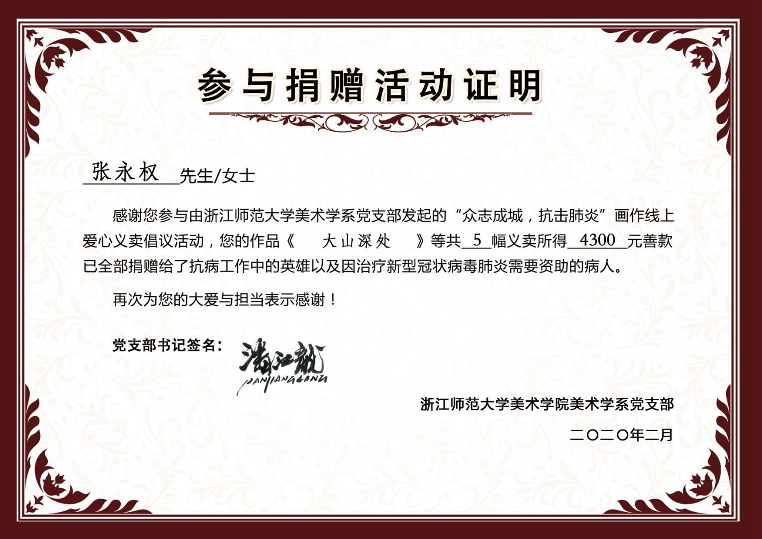 当看到浙江师范大学美术学院美术学系党支部书记潘江龙面向社会水彩画家发起“众志成城,抗击肺炎,从我做起”水彩画作品线上爱心义卖倡议后,张永权通过浙江师范大学美术学院捐出个人画作《深水无波》和《大山深处》等5幅作品用于义卖,所得善款4300元全部捐赠给武汉慈善总会,尽其所能为社会做出贡献。 张永权教授又发动学校更多的老师和周围更多的书画家们参与到义卖活动中,用画笔作为疫情防控的武器。在他的带动下,beat365教师刘吉平(作品《吉祥圣光》)、魏强(作品《钟南山》)、党亚芳(作品《向阳》《绽放》)、达朝辉(作品《暧》《岁月静好》)、陈朝军(作品《绣球花》)、梁小明(作品《怒放》)等都积极行动起来,纷纷捐出自己得意作品支持国家疫情防控工作。
