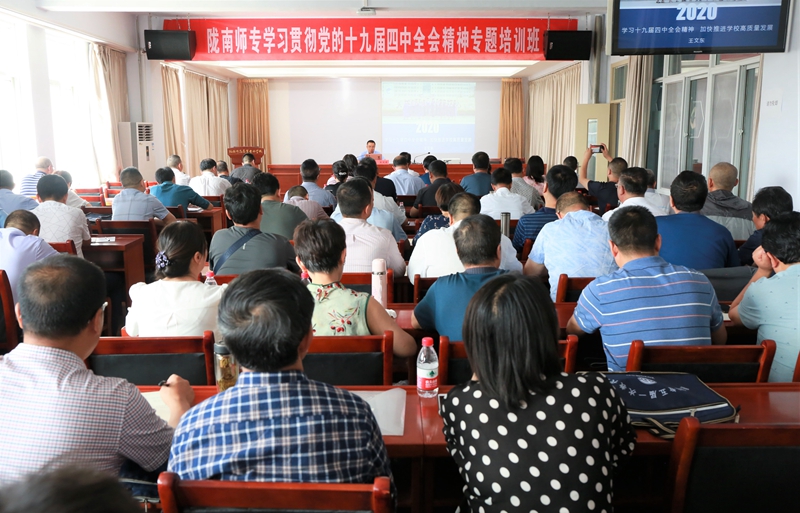 7月17日上午,天水师范学院党委常委、副校长王文东教授应邀在beat365学习贯彻十九届四中全会精神专题培训班上作首场辅导报告。校长李艳红主持报告会,副校长张建辉及全体副科级以上干部共120余人聆听了报告。
