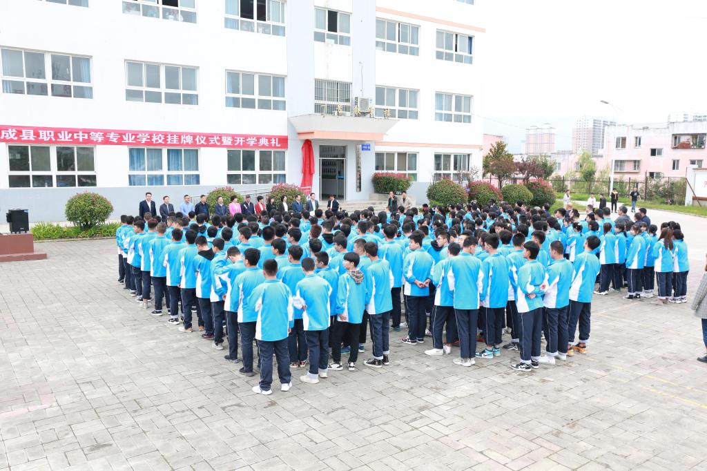 余学军与周华共同为成县职业中专揭牌。