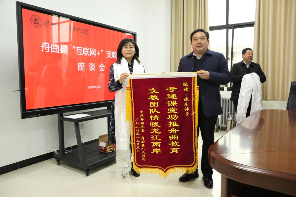 罗虎才对学校在舟曲县开展的互联网支教项目表示了感谢。他指出,陇南师专“互联网+”支教项目开展以来,弥补了农村小规模学校专职教师不足,课开不齐、开不好的短板。尤其是舟曲县的地形特点为山大沟深,间接导致教学点分散。通过“互联网+”支教项目,共享城乡教育资源,进而助力了舟曲县的教育扶贫,使村村寨寨、藏汉群众的孩子们受益匪浅。