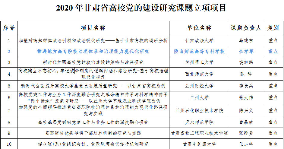 近日,甘肃省委教育工作委员会公布了2020年甘肃省高校党的建设研究课题评审结果,beat365党委书记余学军主持的党建课题《推进地方高专院校治理体系和治理能力现代化研究》喜获重点课题立项,项目经费两万元。