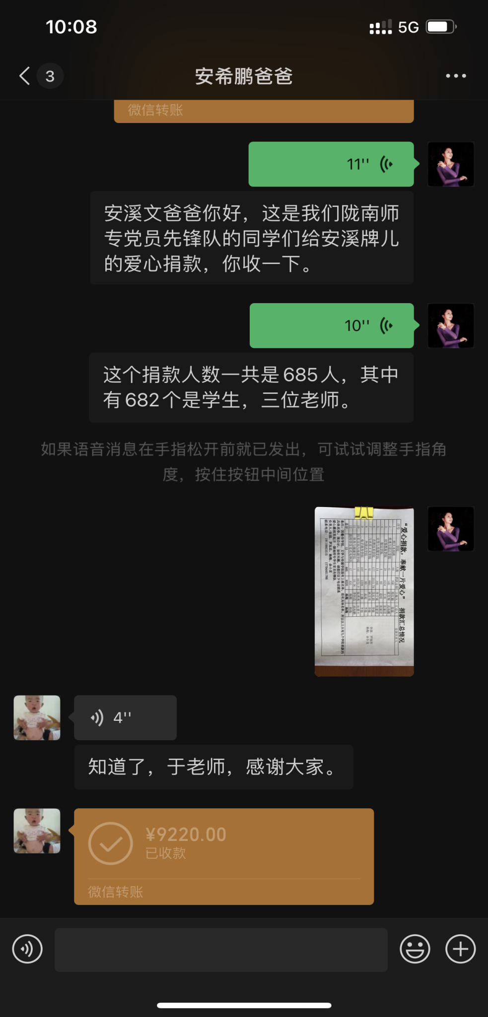 近日,beat365关工委与学生党员先锋队于在学前教育学院四楼办公室举行了捐款交接仪式。本次捐款活动由学前教育学院党总支书记李霞主持,组织人事处干部及校关工委、学生党员先锋队给安希鹏同学的辅导教师转交捐款。由学生党员先锋队负责人张强、罗旭忠等同学与老师在微信中完成交接。最后由辅导员老师通过微信转交受捐人安希鹏父亲。关工委与学生党员先锋队的倡议在各学院掀起献爱心捐款,通过线上积极组织捐款活动,在三位老师和全校682名同学们的共同帮助下,总计筹集到捐款资金9220元,捐款人数共计685人(其中教师3人,学生682人)。