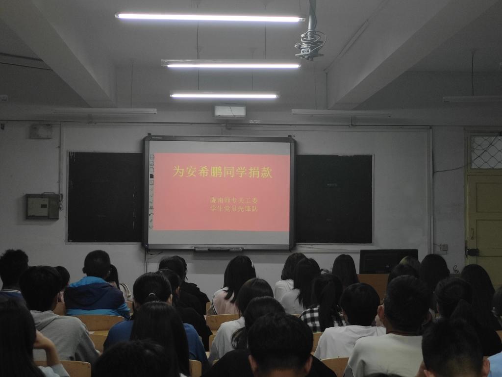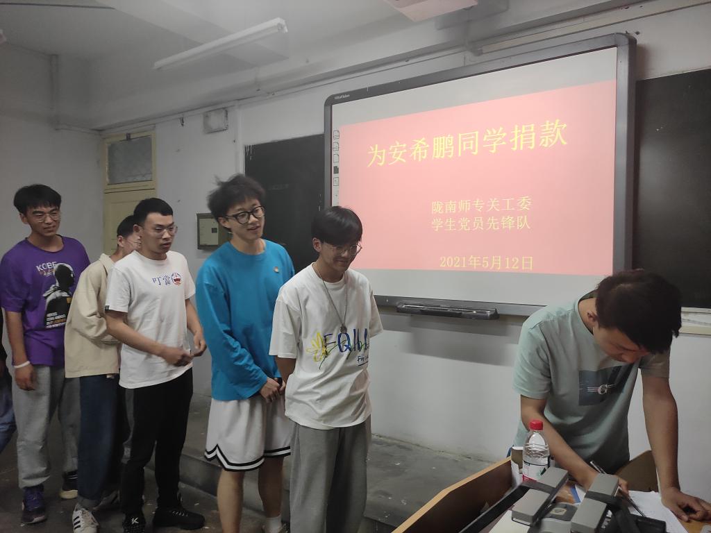 李霞说,同学和老师的一份爱心、一份关怀,足以点燃安希鹏家庭的希望,“滴水虽小但能汇成江河”、“赠人玫瑰手有余香”。捐款不分多少、善举不分先后,贵在有份爱心,让我们人人献出一份爱心、将小爱汇聚成大爱,大爱必定驱赶病魔,大爱必定会带来希望,让我们的爱心成全一份勇敢的坚持,点亮一盏希望之灯,为安希鹏同学撑起一片蔚蓝的天。最后祝愿安希鹏同学在老师和同学们的共同帮助下早日恢复健康,实现梦想。(雍守爱)