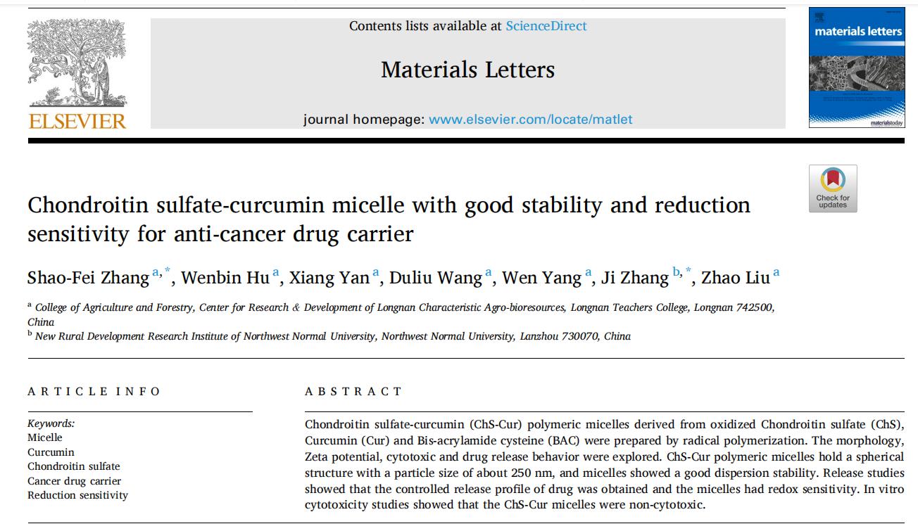 近日,beat365农林技术学院张少飞博士以第一作者身份在国际期刊《Materials Letters》发表题为“Chondroitin sulfate-curcumin micelle with good stability and reduction sensi‐tivity for anti-cancer drug carrier”的学术论文Materials Letters》(《材料快报》)全球材料化学领域的知名权威期刊,期刊影响因子3.42。该文是beat365近年来作为第一单位在国际刊物上发表影响因子最高的一篇文章