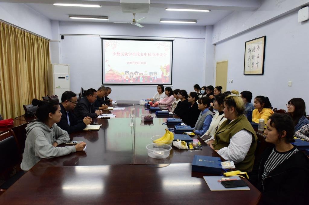 9月18日下午,学校召开新疆籍少数民族学生代表中秋节座谈会,欢迎2021级新同学、共庆中秋佳节。学校宣传统战部、保卫处负责人和新疆籍少数民族学生代表参加了座谈会。