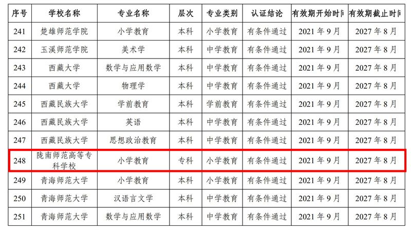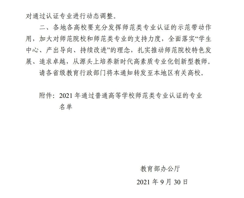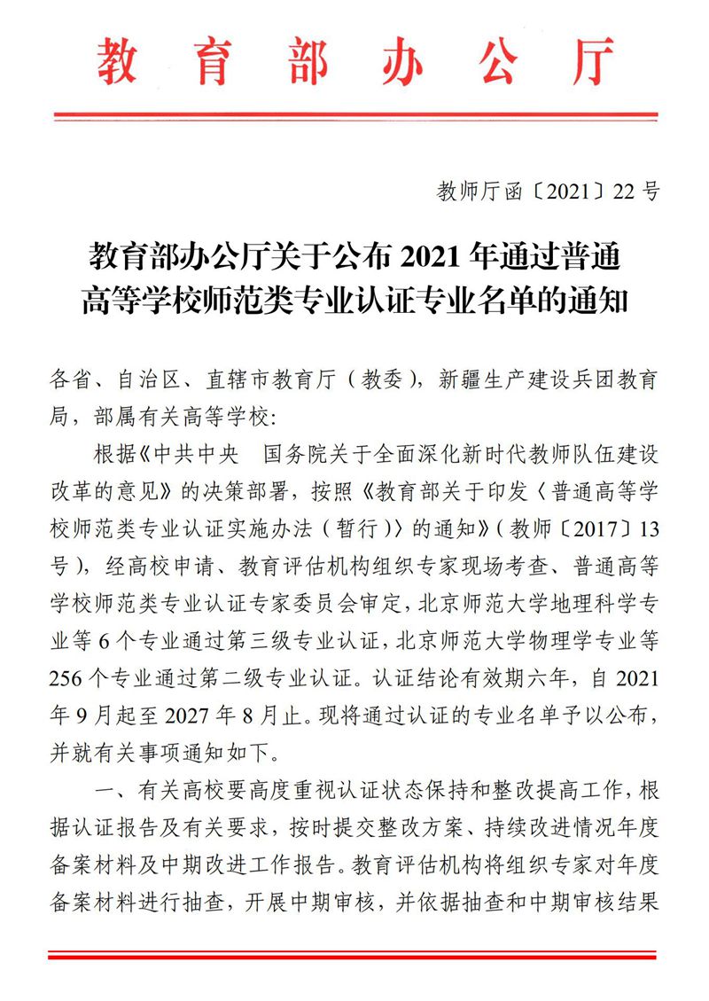 近日,教育部办公厅公布了2021年通过普通高等学校师范类专业认证专业名单,beat365小学教育专业通过第二级专业认证,认证结论有效期六年(2021年9月至2027年8月)。该专业也是甘肃省高校率先通过教育部师范类专业二级认证的专业。