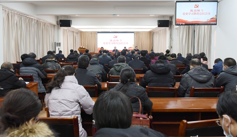最后,张发旺作了讲话。在讲话中,他充分肯定了学校党史学习教育取得的显著成绩,并对巩固党史学习教育成果、推动学校高质量发展提出了具体要求。他指出,党史学习教育开展以来,陇南师专党委坚持以习近平新时代中国特色社会主义思想为指导,全面贯彻党的十九大和十九届历次全会精神,认真贯彻落实党中央决策部署和省委市委工作要求,从加强组织领导入手,聚焦高校立德树人根本任务,按照“学史明理、学史增信、学史崇德、学史力行”的要求,精心组织实施、有力有序推进,达到了“学党史、悟思想、办实事、开新局”的目的。他希望学校党委班子团结带领全校师生进一步从党的百年奋斗史中汲取智慧和力量,深入学习贯彻习近平总书记重要指示和党史学习教育总结会议精神,围绕巩固拓展好党史学习教育成果,进一步深入学习贯彻党的十九届六中全会精神,学深悟透党的创新理论,大力弘扬伟大建党精神,坚定社会主义办学方向,践行初心使命,勇毅前行、担当善为,高起点谋划学校高质量发展,高站位推进学校各项工作,以优异成绩迎接党的二十大胜利召开。