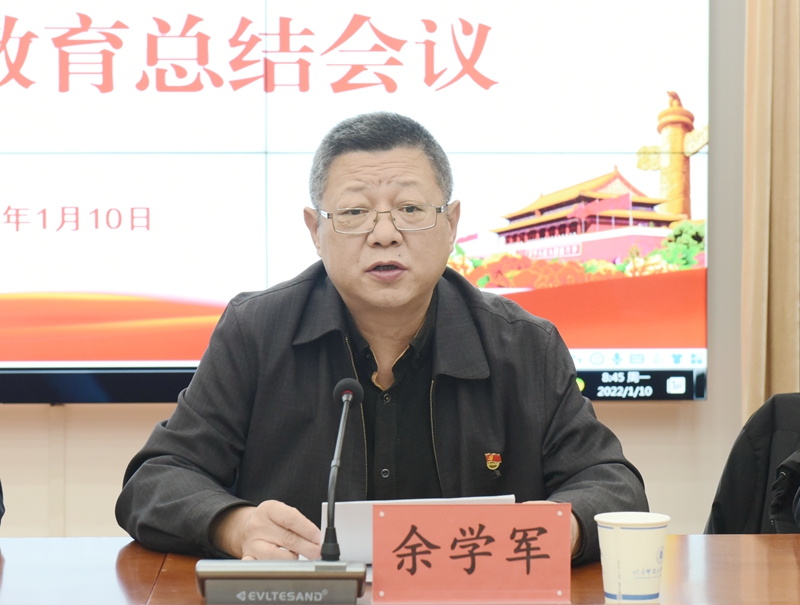 余学军代表学校党委从落实党委主体责任,强化组织领导,全力推进学习教育;突出党史学习教育重点,加强理论武装,全面提高思想认识;丰富学习教育载体,凸显学校特色,党史育人成绩斐然;着眼师生群众期盼,推动学校发展,学习教育成效显著等四个方面全面总结了学校党史学习教育开展情况。