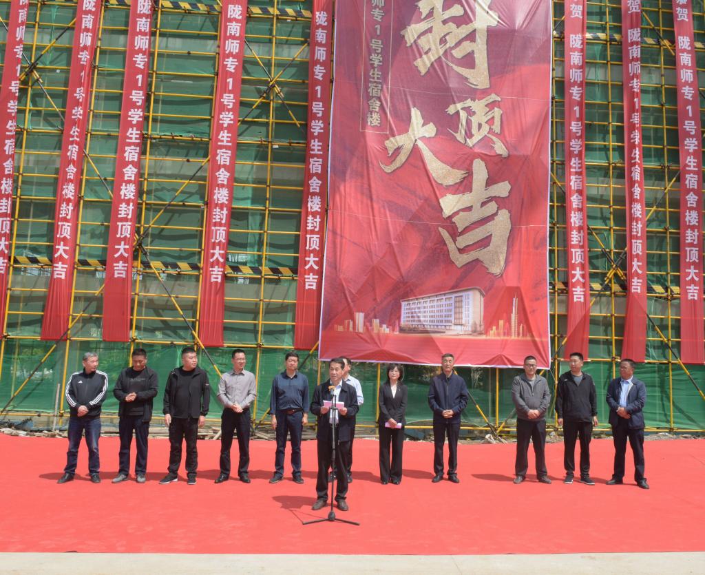 仪式上,李艳红致辞。她代表学校向出席封顶仪式的领导和嘉宾表示热烈欢迎,向为学校建设发展做出贡献的全体人员表示由衷感谢。她说,东校区1号学生公寓楼自开工以来,在陇南市委市政府领导的高度重视支持下和成县县委县政府领导的大力协调下,项目部全体员工全力以赴,克服重重困难,高标准,高速度地完成了1号学生公寓楼主体封顶工作。她希望项目施工单位继续保持主体工程建设的激情,把主体结构封顶当做新的起点,继续发扬团结合作、锐意进取的精神,精益求精,创建精品工程,脚踏实地、搞好后续工程建设,确保工程如期完成,让学生能够早日享受更舒适的住宿环境。