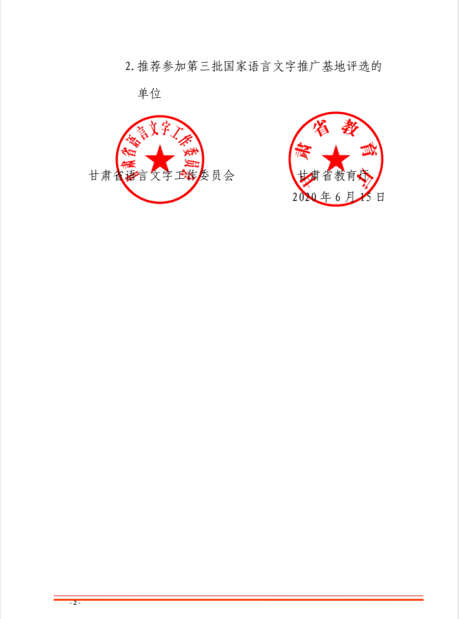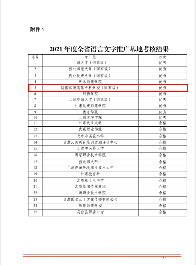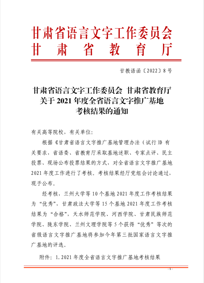 近期,甘肃省语言文字工作委员会、甘肃省教育厅发布《关于2021年度全省语言文字推广基地考核结果的通知》(甘教语函〔2022〕8号)中,beat365国家语言文字推广基地考核结果为优秀等次。