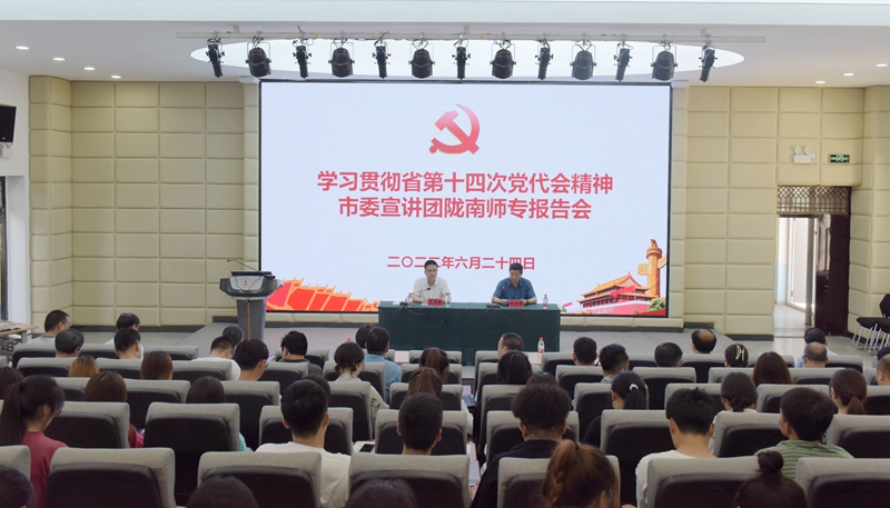6月24日,学校举办学习贯彻省第十四次党代会精神市委宣讲团宣讲报告会。市委宣讲团成员、市纪委副书记、市监委副主任张雷雨作辅导报告。副校长任永峰主持报告会。各部门负责人、各学院党总支书记、师生代表共计120余人参加了报告会。